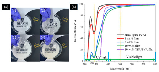 (a) Photographs of the film: (1) pure PVA, (2) 1 wt. % film, (3) 5 wt. % film, (4)10 wt. % film; (b) Transmission spectra of the composite films with various hemp hurd additions in this study and TiO2/PVA film reproduced from Liu et al. [42].