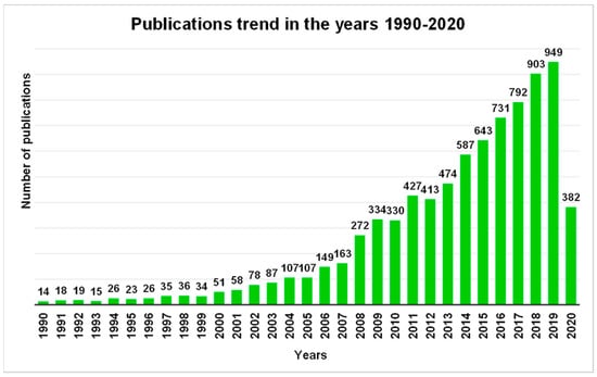 In the last decades, antimicrobial polymers have aroused increasing interest among scientific community until becoming a “hot” topic as confirmed and highlighted also by the publications trend in the years 1990–2020 (Figure 2).