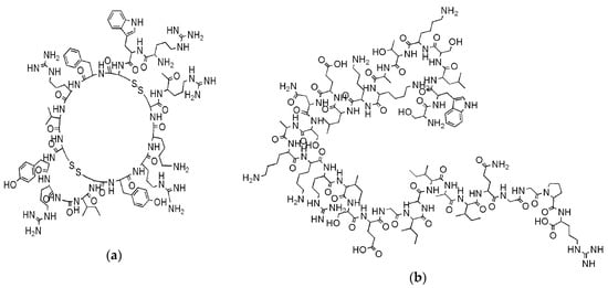 For years, it was replaced by innovative and less toxic aminoglycosides, quinolones and β-lactams, but the increasing incidence of MDR Gram-negative bacteria has coerced scientists to reconsider systemic polymyxins, since currently are often the only available antibiotic agents effective against MDR organisms, as the carbapenemase-producing bacteria []. Although it seems less probable to occur than for classical antibiotics, the probable development of bacterial resistance to CAMPs is an additional distress associated to their massive application [,]. Anyway, while traditional antibiotics, in order to neutralize bacteria, generally targets three organs consists: cell wall, translation machinery and DNA replication system and each one of these modalities of acting is susceptible to bacterial resistance, CAMPs are effective also without interfering with specific metabolic processes []. By acting with a rapid and non-specific disruptive action on bacteria membranes, they inhibit the growth of pathogens or kill them simply on contact and before bacteria manage to organize adaptive processes for becoming resistant in time. As reported, some CAMPs, as tachyplesin II and cecropin P1 (Figure 3a,b, respectively) proved limited evolution of resistance and, antibiotic-resistant bacteria display no cross-resistance towards them [].