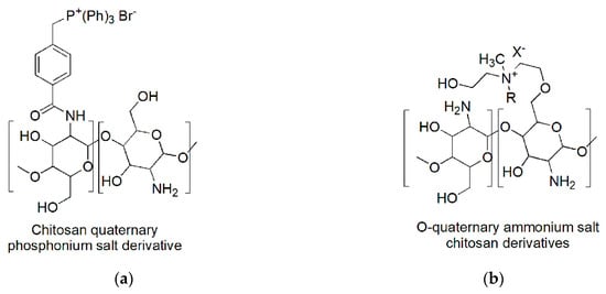 Chitosan derivatives permanently protonated were prepared by exploiting either the amine groups or the hydroxyls to insert phosphonium or ammonium salt functions. It is the case of the chitosan derivatives used by Zhu et al. (2016) [] (Figure 5a) and by Wang et al. (2016) (Figure 5b) [].