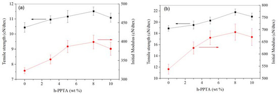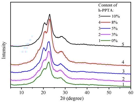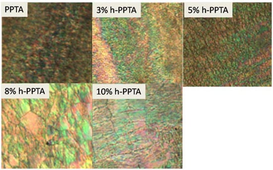 | Content of h-PPTA (%) | Crystallinity by XRD (%) | Orientation Factor (fc) by XRD | Orientation Factor (fs) by Sonic Velocity |