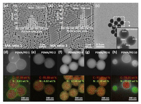 (a,b) SEM images of PSMA nanoparticles prepared with different maleic anhydride (MA) ratios; (c) TEM image of PSMA/PEI core–shell nanoparticles; (d) EDS mapping of the carbon and nitrogen contents in the shells of PSMA/PEI core–shell nanoparticles prepared with various PEI/PSMA ratios: (d) 1, (e) 2, (f) 4, (g) 6, and (h) 10.