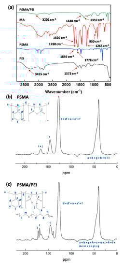 (a) FT-IR spectra of PSMA/PEI core–shell nanoparticles, PSMA, PEI, and MA; 13C-NMR spectra (500 MHz) of (b) PSMA and (c) PSMA/PEI.