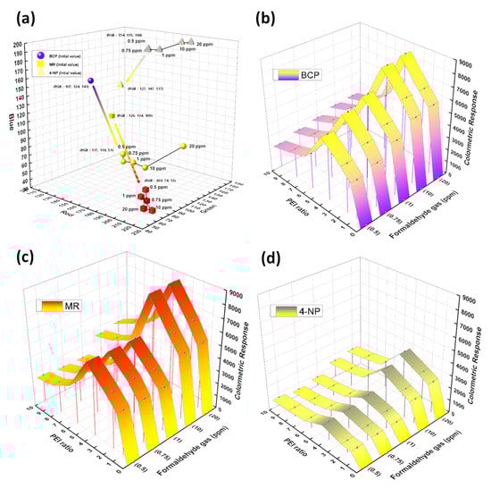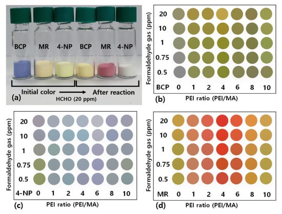 As shown in Figure 3a, the various sensors exhibited different colors after exposure to 20 ppm of formaldehyde gas. The colorimetric sensors were blue, light yellow, and yellow before gas exposure (left), but turned yellow, white, and red, respectively, after the gas exposure (right). However, the formaldehyde gas sensors did not exhibit color changes at room temperature and humidity. Figure 3b–d show the degree of color change based on the PEI content and formaldehyde gas concentration. In particular, the color change of the MR sensor (Figure 3d) is more prominent than those of the BCP and 4-NP sensors (Figure 3b,c). Notably, the initial colors of the dyes were retained within the core–shell nanoparticles. This result implies that PCSNPs are suitable as colorimetric gas sensors.