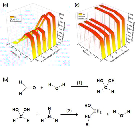 The reaction between formaldehyde and an amine forms an imine (Schiff base), resulting in a change in pH that causes a change in the color of the pH dye. However, when the humidity increases, instead of the reaction between formaldehyde and the PEI shell layer, formaldehyde reacts with water to form methylene glycol, as shown in Figure 5b. As a result of this continuous reaction, the formation of the Schiff base is reduced and the extent of the pH change is reduced []. Subsequent reaction with an amine group of PEI removes methylene glycol, which results in a decrease in the pH and the color change rate. Hence, imine formation cannot occur on the surface of core–shell nanoparticles in the presence of excess humidity. As a result, the MR colorimetric sensor at 30 RH% was more effective for detection of formaldehyde owing to a high extent of imine production. As a result, when using a formaldehyde gas detection sensor at 30 RH%, it is possible to suppress the production of methylene glycol and to observe a distinct color change corresponding to the reaction of PEI and formaldehyde.
