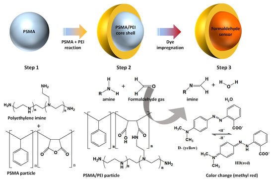 Schematic illustration of the preparation of a colorimetric sensor for formaldehyde gas based on poly(styrene-co-maleic anhydride) (PSMA)/polyethyleneimine (PEI) core–shell nanoparticles doped with a pH indicator dye.