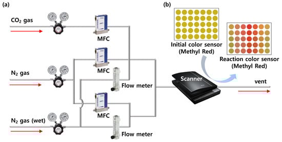 Schematic illustration of the sensor test system with multi-gas flow controllers (MFCs). (a) MFC system. The flow rate of the source was continuously adjusted to control the formaldehyde concentration in the gas flowing into the chamber (up to 1000 sccm). (b) Sensor test system. The bottom of the chamber was transparent so that color changes could be observed using a scanner.