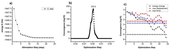 Figure 1 shows that with C13H8OS–H, when increasing the number of steps, the total energy of the system (Etot) will decrease from Etot = −1947.7 eV to Etot = −1948.4 eV (Figure 1a). There is a change in electronic density. The maximum value at the equilibrium position is of 232.5 eV (Figure 1b) and the electronic state decreases (Figure 1c) with the number of steps. The results show also that if the number of steps increases, the material will change from the initial state to the equilibrium state. The structural and electronic characteristics of materials in equilibrium state as a function of step number is conducted with a thickness of layers (h), h = 6 Å. The obtained results are presented in Figure 2 and summarized in Table 1.
