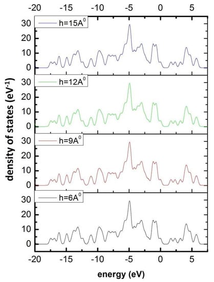 The increasing distance of the atomic layer leads to Eg increases and reaches to a maximum value at h = 9 Å. For more details, the total density of the states of the poly C13H8OS–H material with increasing thickness of the layers at the density of the states at different energies in the valence band and the conduction band is conducted. The obtained results are shown in Figure 3.