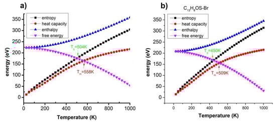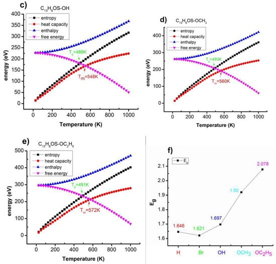 When C13H8OS–X is doped/modified by different atoms or functional groups: H, Br, OH, OCH3, and OC2H5, the different energies of the molecule, the structure, electronic structure as a function of temperature were calculated and then plotted in Figure 4.