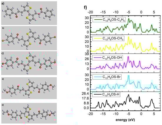Figure 5. The structural shapes of C13H8OS–H (a), C13H8OS–Br (b), C13H8OS–OH (c), C13H8OS–OCH3 (d), C13H8OS–OC2H5 (e), and the electronic energies structures with poly different (f).