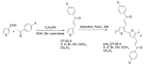Scheme 1 presents the synthetic procedure of the poly (C13H8OS–X) where X are H, Br, OH, OCH3 and OC2H5. To study the structural characteristics, transition temperatures and electronic structure of poly[3-(3-phenyl prop-1-ene-3-one-1-yl)thiophene], DFT [52,53,54,55] with the DMol3 module [54] of the copyrighted Material Studio software, a commercial software package installed at the Center for a Computational Science of the Hanoi University of Education (Hanoi, Vietnam) was used. This is a modeling and simulation with the GGA package [56] for which the parameters of the PW91 exchange-correlation function [57,58] and the K-point grid sampling of the diagram Monkhorst-Pack [59] were set into a tridimensional cell unit with a defined dimensions a, b, and c as follows: poly(C13H8OS–H) (a = 20 Å, b = 13 Å, c = 6 Å), C13H8OS–Br (a = 26 Å, b = 13 Å, c = 6 Å), poly(C13H8OS–OH) (a = 26 Å, b = 13 Å, c = 6 Å), C13H8OS–OCH3 (a = 29 Å, b = 13 Å, c = 6 Å) and C13H8OS–OC2H5 (a = 32 Å, b = 13 Å, c = 6 Å). The electrons interact with each other through the Density Function Semi-core Pseudo-Potential [60] and thus the electrons are considered in a homogeneous state. The energy was set at 1 × 10−6 eV, the displacement during the geometry optimization is at level 1 × 10−5 Ha/integer, and 5 × 10−3 Å.