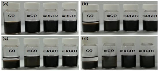 Colloidal suspensions of GO, mGO, mRGO2 and mRGO1 (a) just after sonication, (b) 18 h, (c) 48 h and (d) 144 h after sonication.