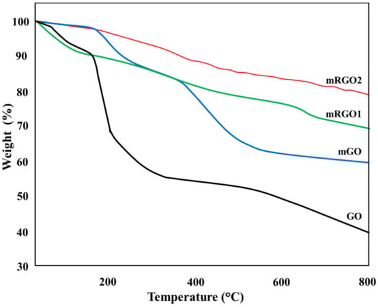 Thermogravimetric analyzer (TGA) thermograms of GO, mGO and mRGOs.