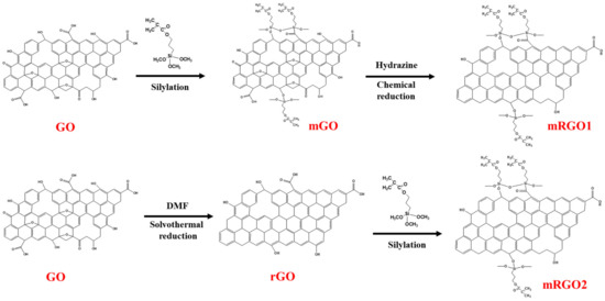 GO was synthesized from graphite using Hummers’ method. MPS was used to modify GO to yield MPS-modified GO (mGO), which was subsequently reduced via chemical reduction with hydrazine (mRGO1). GO was also reduced via solvothermal reduction using DMF followed by silylation with MPS (mRGO2).