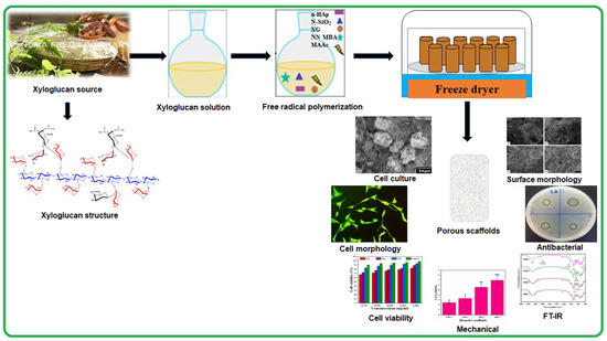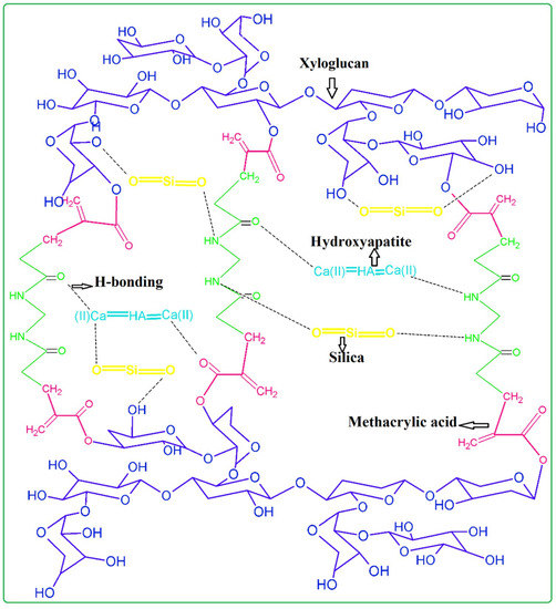 Xyloglucan (XG) is also a well-known biological macromolecule with wide biomedical applications. It is famous for pharmaceutical applications due to controlled swelling ability, biocompatibility and biodegradable properties with water-soluble and non-toxic and nonirritant polysaccharide. XG consists of polysaccharide 1,4-β-D-glucan backbone with partial substitutions of the 1,6-β-D-xylopyranosyl side chain and additionally substituted with 1,2-β-D-galactopyranosyl residue [9,10]. The commercial tamarind kernel powder is a significant source of XG raw material. XG has bared many applications; it has been used as a common excipient in cosmetics, food additive and acts as stabilizer and thickener agents [11,12]. A suitable polymeric composite was prepared via blending with cations Ca2+ and these cations interacted with a negatively charged hydroxyl group (OH−) of polysaccharide chain due to the electrostatic force of interaction, which resulted in the formation of the 3D network. Polysaccharide-based scaffolds have a limitation because of poor/inadequate mechanical properties. Ceramic-based materials (hydroxyapatite (HAp)) have substantial mechanical and biocompatibility for hard tissue engineering [13]. In the present study, silica has been selected as an essential material, well known for its lightweight and excellent mechanical properties. Biomaterials based on nanocomposites gained the attention of scientists because of their porous, wide surface area and biocompatibility, compared to other ceramic materials [14,15]. Silicon dioxide or silica (SiO2) demonstrates numerous applications in drug delivery and tissue engineering as an ultimate biomaterial. SiO2 nanoparticles have a wide surface area, resembling the biopolymer matrix of bio-composite materials. Bioglass with silica nanoparticles not only provides mineralizing, porous and lightweight capabilities for polymeric scaffolds but also increases its strength as a polymer composite scaffold, having desirable biomaterial properties [16,17].