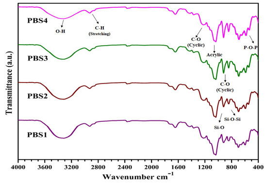 Typical spectral Fourier transform infrared spectroscopy (FTIR) profiles present peaks for different functional groups and their various modes of vibrations for all samples of polymeric bioactive scaffolds.