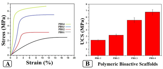 Figure 4 illustrates the compression strength of bioactive scaffolds samples in our study. It is highly challenging but important to maintain the mechanical strength of our scaffolds during cell growth and proliferation. It not only physically safeguards the cells but also provides compatible mechanical strength to mimic in vivo environments that have stronger influences over cell proliferation and differentiation. The ceramic phase (n-HAp and n-SiO2) has an extraordinary role to increase biomechanical features of several polymeric materials [29,30]. The incorporation of n-SiO2 increased the compression strength of the polymeric bioactive scaffolds (UCS of PBS1 = 2.4 MPa, PBS2 = 3.2 MPa, PBS3 = 5.7 MPa, PBS4 = 6.9 MPa). The sample PBS3 has better efficacy to bear the load with suitable porosity levels that eventually increased the mechanical properties of the fabricated polymeric bioactive scaffold. All polymers have different chemical structures that affect the grain boundary of the matrix. The properties of ceramic material (n-HAp and n-SiO2) is a function of pore size, porosity and grain boundary that is decreased with decreasing in grain size.