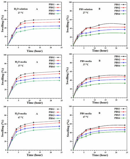 Figure 5 discusses the swelling analysis of polymeric bioactive scaffolds in deionized-water and phosphorous buffer saline solution. Identical amounts of scaffolds were immersed in deionized water and PBS solution. The polymer bioactive scaffolds are found to have diverse swelling patterns in different media at different temperatures, because of different n-SiO2 concentrations. Osmotic pressure may increase or decrease because of the hydrogen bonding (H- bonding) among the scaffold and media at varying temperatures. The swelling rate decreased and osmotic forces are balanced at equilibrium after increasing the time. The extraordinary difference in water absorption is not observed with time until it has reached a plateau [31]. Initially, more water molecules interacted with porous scaffolds and decreased when the equilibrium point is near. Sample (PBS1) with the maximum amount of n-SiO2 has maximum swelling in water media at 47 °C. Whereas, sample (PBS4) with a little amount of silica at 27 °C has the least swelling. It is obvious (Figure 5) that swelling has an inverse relationship to the ceramic quantity within the polymeric network. Due to the relatively hydrophobic nature of ceramic materials in XG-graft-MAAc and ceramic materials, the different swelling behaviors of these bioactive scaffolds can react as a crosslinker. As a consequence, by increasing ceramic quantities into a polymeric network, which generates additional crosslink points in polymer networking and decreases elasticity which decreases swelling behavior.