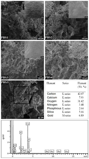 The surface morphology of the bioactive polymeric scaffolds was examined using SEM as shown in Figure 6. The various magnifications exhibit rough and porous topography of polymeric bioactive scaffolds (evident from the XRD results), which remarkably encourage cell adhesion and proliferation on the scaffold [32,33]. At higher magnification, however, the SEM images show a specific porous morphology which also supports cell infiltration, adhesion and extracellular matrix secretion. The bioactive polymeric scaffolds show different pore sizes distributed uniformly through the samples. The average pore size of PBS3 is 80–140 μm, which is ideal for osteointegration and 50–200 μm is optimal for cell attachment, proliferation and osteoblast cells. The PBS3 sample has a uniform distribution of pore size in the structure and is ideal for significant cell proliferation demonstrating excellent cell growth capability. [34]. During the SEM analysis, n-SiO2 was found to have imparted its role in porosity, as the increasing quantity of n-SiO2 caused increased pores and porosity. The PBS3 sample was chosen because of the uniform pore size used for chemical composition analysis with EDX [33]. EDX study reveals the different amounts of elements present in sample PBS3. Results show the presence in the porous bioactive scaffold of carbon (C), oxygen (O), silica (Si), calcium (Ca) and phosphorus (P) elements (Figure 6), which help grafted-XG in manufactured bioactive polymer scaffolds.