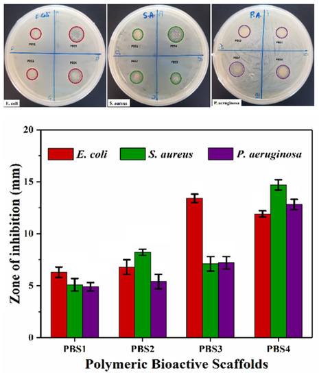 Antibacterial activities of scaffolds were performed via agar disc-diffusion assay against various sever pathogens (E. coli, S. aureus and P. aeruginosa) and zone of inhibition was measured as seen in Figure 7 [35]. Antibacterial activity of scaffolds is due to the penetration of silica and hydroxyapatite nano-particles into bacteria to interact with the cellular protein. The denatured proteins were caused by silica and hydroxyapatite nanoparticles and by the accretion of external fluids to give silica/hydroxyapatite scaffolds better antibacterial activities. The charged bacterial surface membrane (phospholipids and lipopolysaccharides) interacts with several functional groups of bioactive polymeric scaffolds [36,37]. These active sites of bioactive polymeric scaffolds allowed their changes into the bacterial membrane to obstruct bacterial activity. Bacterial growth is overdue due to the interaction between the polymeric portion of scaffold and bacterial DNA. Molecular alteration in DNA because of polymeric and SiO2/HAp nanoparticles of bioactive polymeric scaffolds that caused little to no bacterial growth. All samples of polymeric bioactive scaffolds, therefore, exhibited antibacterial activity due to components of polymeric bioactive scaffolds and also increasing quantities of silica nanoparticles [38].