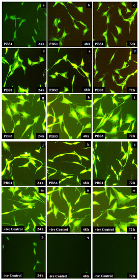 The optical images cell morphology that is taken by an optical microscope of all polymeric bioactive scaffolds (PBSs) samples PBS-1 (a–c), PBS2 (d–f), PBS3 (g–i), PBS4 (j–l), +ve control (m–o) and –ve control (p–r) at different time interval 24, 48 and 72 h.