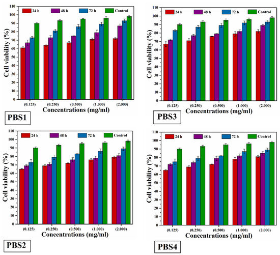 Cytotoxicity assay was carried out using the pre-osteoblast mouse (MC3T3-E1) cells by rising against all scaffolds. Cell viability was evaluated for each concentration of all samples and recorded at different time intervals using Neutral red uptake assay by incubation (24, 48 and 72 h) [31,33]. As the amount of n-SiO2 increases, polymeric bioactive scaffolds show greater cell viability and non-toxicity against pre-osteoblast mouse (MC3T3-E1) cells (Figure 9). PBS3 has no or less toxic cell viability that promotes pre-osteoblast (MC3T3-E1) cell differentiation to help the bone formation and plays an important role in tissue engineering for bone regeneration.