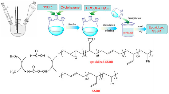 Cyclohexane was added to a three-necked flask. The SSBR was then added at a mass-to-volume ratio of 10 g/100 mL. The mixture was stirred until the rubber was dissolved. The temperature was set at 40 °C. Hydrogen peroxide was used in excess of the polymers double bond content (H2O2/C=C 1.5/1), and formic acid was added at a ratio of the reactant mol (H2O2/HCOOH 3/1) to generate in situ performic acid. The mixing was done at 50 rpm rotor speed with a mechanical stirrer. Formic acid was all added one time, and hydrogen peroxide was added by the rate of 3 mL/min with an addition funnel. At the end of the reaction, the mixture was neutralized with a (5% w/v) Na2CO3 solution and washed with distilled water. After removing the aqueous phase, the organic phase was coagulated in ethanol and dried under vacuum to a constant weight. The reaction principle and flow of ESSBR preparation was described in Figure 1.