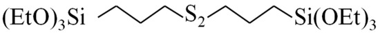 In the 1970s, it was found the silica ability to be modified by silane coupling agents such as bis-(γ-triethoxysilylpropyl)-tetrasulfide (TESPT) or bis-(γ-triethoxysilylpropyl)-disulfide (TESPD) which can improve the compatibility between silica and rubber [11,12,13]. In this process, the silane coupling agent reacts with the hydroxyl on the surface of silica and makes the silica turn from hydrophilic to hydrophobic [14,15]. It usually requires a high temperature (150 °C) for this reaction when the mixing of rubber compounds begins. Inevitably, volatile organic compounds (VOCs) [16,17,18,19] like methanol and ethanol will be produced during this process [20,21], which is harmful to rubber performance and worker’s health [22,23].