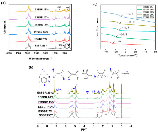 Figure 3a shows the FT-IR spectra of the synthesized product. Peaks at 760 cm−1 are related to 1,4-cis, those at 966 cm−1 to 1,4-trans, and those at 911 cm−1 to 1,2-vinyl double bonds, respectively. The new peaks at 1260 and 801 cm−1, which refer to the symmetrical stretching deformation absorption peak of C–O–C and the asymmetric extension deformation vibration absorption peak of C–O–C, respectively, can be observed from the ESSBR curve, indicating that the epoxy groups have been introduced into the molecular chain of the SSBR.