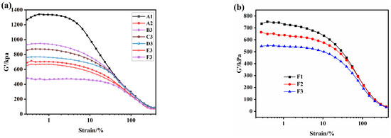 The strain amplitude dependence of the storage modulus (G’) of silica/SSBR/BR compounds are shown in Figure 4. The filler’s network and its situation of agglomeration make a great influence on the modulus of rubber compounds. The G’ decreases rapidly with the increase of strain amplitude, named the Payne effect [39,40], which is closely related to the breakdown of the filler network structure in rubber matrix when the deformation rate of specimen increases. The difference between the maximum and the minimum G’ in the curve names the ΔG’ value, which is usually negatively correlated to the dispersion of filler. The lower the ΔG’ value, the better the filler disperses.