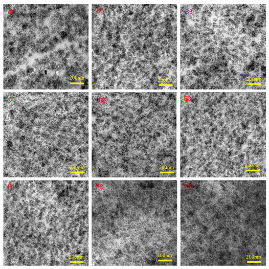 TEM images of PS-SSBR/BR(A1), TS-SSBR/BR(A2), E7-SSBR/BR(B3), E10-SSBR/BR(C3), E15-SSBR/BR(D3), E20-SSBR/BR(E3), E25a-SSBR/BR(F1), E25b-SSBR/BR(F2) and E25c-SSBR/BR(F3).
