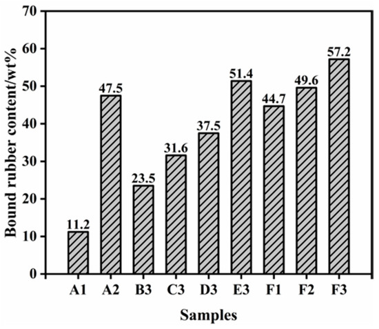 Bound rubber, which is the adsorbed rubber on the filler surface, is influenced by the interfacial interaction between the filler and rubber. The bound rubber contents of the silica/SSBR/BR compounds were measured, as shown in Figure 6. When the ratio of SSBR replaced by ESSBR is 40%, it can be seen that the bound rubber content increases with the increase of the epoxy degree of ESSBR. As more epoxy groups react with silica [41,42], the hydrophilicity of silica decreases and the interaction between silica and rubber improves. It also can be seen that when the epoxy degree of ESSBR used remains at 25%, with the increase of the ratio of ESSBR/SSBR, the bound rubber content increases.