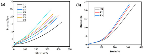 It can be seen from Figure 5 that the silica in E25-SSBR/BR (F3) has the best dispersion, even dispersing better than silica in TS-SSBR/BR(A2). The dispersion of silica in E15-SSBR/BR (D3) and E20-SSBR/BR (E3) is comparable to that of TS-SSBR/BR(A2). Previous studies [43,44,45] have indicated that the chemical interaction between silica and rubber can make its dispersion in the rubber matrix more stable, as silica is not easy to aggregate again because of the stability of the chemical interaction between silica and rubber. TESPD has the ability to create the chemical interaction between the silica surface and rubber. On the one hand, ESSBR can make chemical interactions with silica, on the other hand, it can be well mixed with rubber matrix. Similar to TESPD, ESSBR can also improve the dispersion of silica in the rubber matrix by forming a chemical interaction between silica and rubber.