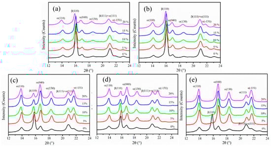 X-ray diffraction (XRD) curves of the isotactic polypropylene (iPP) sheet after stretching at different temperatures: (a) 110 °C, (b) 120 °C, (c) 130 °C, (d) 140 °C, and (e) 150 °C.