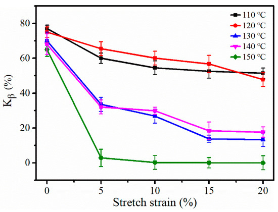The relative fraction of β-modifications (Kβ, obtained from Equation (1)) of the iPP sheet are shown in Figure 2. It was known that Kβ decreased with an increase in the stretching temperature. When the stretching temperature was lower, Kβ decreased slowly because fewer β-modification lamellae were damaged by stretching. When the stretching temperature was above the crystallization temperature (i.e., 124 °C), Kβ also showed a downward trend. Therefore, the phase transformation process occurred, owing to the slippage and rearrangement of the molecular chains of the lamellae. The change in Kβ was small when the stretching strain was between 15% and 20%, which can be explained by the stress relaxation accelerating the slippage of the newly formed α-modifications. However, Kβ rapidly decreased to near zero once the stretching temperature increased to 150 °C, during which time, a large number of α-nuclei were generated. Subsequently, the molecular chains were folded on its surface to produce α-modifications.