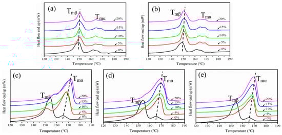 The melting curves of the iPP sheet after stretching at different temperatures: (a) 110 °C, (b) 120 °C, (c) 130 °C, (d) 140 °C, and (e) 150 °C.