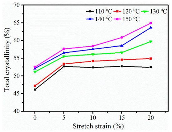 For semi-crystalline polymers, crystallinity is an important factor for the properties of the material [34]. The total crystallinity (Xc, obtained from Equations (2) and (3)) of the iPP sheet at different stretching temperatures is shown in Figure 4. The Xc increased with an increase in the stretching temperature because of the oriented molecular chains. While the stretching temperature was below the crystallization temperature, the phase transformation process did not occur due to the large internal friction of the movement of the lamellae. Therefore, Xc did not change greatly with an increase in the stretching strain. When the stretching temperature was 130~140 °C, according to the previous results, the β-modifications gradually transformed into α-modifications. As the stretching strain was increased from 5% to 15%, Xc increased slowly, implying that the external force work mainly promoted the crystal phase transformation and had little effect on the crystallinity. When the stretching strain was 20%, the degree of the molecular chain orientation of the iPP sheet increased, which promoted the process of crystallization. When the stretching temperature was 150 °C, the transformation from β-modifications to α-modifications resulted in an increase in the crystallinity.