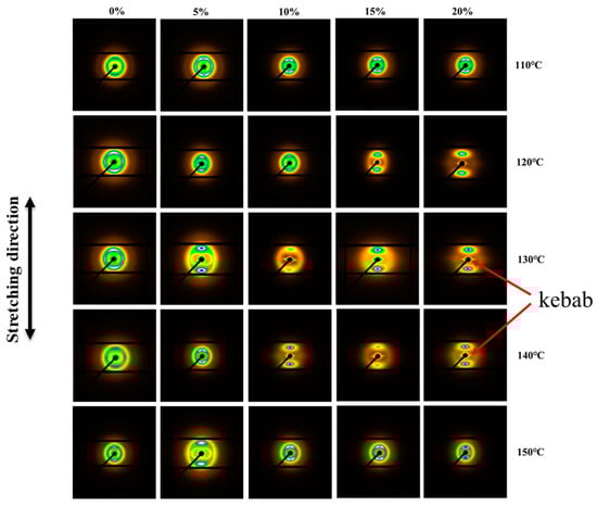 Two-dimensional small-angle X-ray scattering (2D-SAXS) patterns of the iPP sheet after stretching at different temperatures.