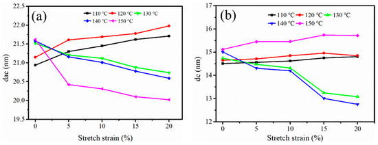 The dac and dc derived from Figure 6 are shown in Figure 7. In Figure 7a, when the stretching temperature was 110~120 °C, dac increased with increasing stretch strain. This was because the molecular chains between the adjacent lamellae were stretched. When the stretching temperature gradually increased to 130~140 °C, it was observed that the dac decreased slightly. It was clear, based on the research results in Figure 5, that a stable shish-kebab structure had been formed. Simultaneously, when the stretching strain continued to increase, the embedding of the inter-lamellae molecular chains counteracted the increased distance between adjacent lamellae, which could also explain the reduction in dac. Mao et al. [38] studied the influence of the deformation induced on the dac of iPP. They exposed that the dac decreased due to densely packed lamellae, and then increased owing to the separation of lamellae. When the stretching temperature was 150 °C, dac decreased with the increasing stretch strain. This can be explained by the fact that the crystal lamellae of the iPP sheet melted and formed α-modification nucleation sites at a higher temperature, which induced the transformation of β–α modifications; α-modifications were densely packed, and the long period decreased.