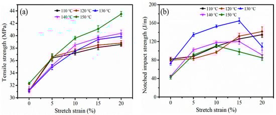 It is well known that the mechanical properties of iPP sheets are related not only to crystallinity, but also to the micromorphology of the crystal structure. The mechanical properties of the iPP sheet in this study at different stretching temperatures are shown in Figure 9. In Figure 9a, the tensile strength increased under increased stretching. When the stretching temperature was 150 °C, the tensile strength increased by 34% as the stretching strain increased to 20%. The molecular chain orientation promoted an increase in the total crystallinity, which resulted in an increase in tensile strength [42]. In addition, the β-modifications in the iPP sheet system were almost completely melted and recrystallized to α-modifications, which improved the tensile strength. Figure 9b shows the notched impact strength of the iPP sheet. It was found that the notched impact toughness increased with the increasing of the stretching strain when the stretching temperature was 110~120 °C. Thus, it was concluded that the molecular chains were oriented. When the stretching temperature exceeded the crystallization temperature, the notched impact strength of the iPP sheet after 15% stretching strain at 130 °C increased by 126% compared to the initial iPP sheet. According to the analysis results in Figure 5, there was a crystal phase transfer process in the system at this time, and a shish-kebab cylindrite structure existed. The metastable shish-kebab cylindrite structure could absorb more energy to transform into a stable crystal structure. Thus, the impact toughness was significantly improved [43]. When the stretching strain was 20%, the shish-kebab-like crystal phase transfer process did not dominate. As a result, the impact toughness was reduced.