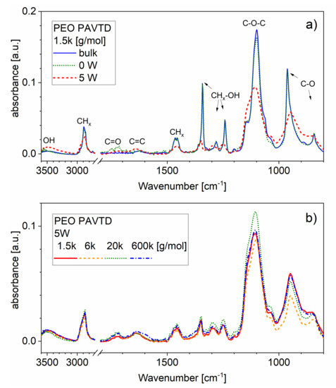 The infrared spectra of the films (Figure 1a) show the peaks typical for bulk PEO as found in the literature [24]. The spectra are dominated by C–O and CHx bonds with a minimal amount of C=O bonds. Plasma polymerized films show an increased amount of –OH, C=O, and C=C bonds and decreased amount of C–O–C bonds. Generally, the PEO-like structure is retained in the films, with visible broadening of the peaks compared to the bulk precursor, which could correspond to the change from crystalline to amorphous phase. This is more pronounced in plasma-polymerized films, corresponding to a higher fragmentation of the polymer chains suggested by GPC analysis. This trend is independent of the Mw of the bulk precursor (Figure 1b).