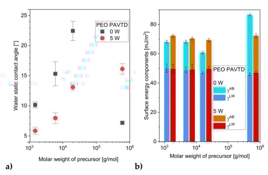 The wettability and surface energy of prepared PEO-like plasma polymer films are shown in Figure 2. As expected, the higher surface energy is correlated with higher wettability [28]. The water contact angles of the films (Figure 2a) increased with the Mw of bulk precursors and decreased for plasma polymerized films, except for the film prepared from the precursor with the highest Mw. The reason could lie in the fact that higher Mw led to lower surface roughness, which caused enhanced wettability [29]. The surface roughness slightly increases with the Mw of the precursor, from 3 nm RMS roughness for the 1.5k precursor to 10 nm for the 600k precursor. The roughness of the films prepared under 5 W plasma power somewhat lower (see Table 2). A similar trend has been observed for films prepared using PAVTD of polyimide [19]. The fact that the most significant drop in relative surface roughness was found in the samples prepared from 600k at 0 and 5 W helps to explain the observed decrease in contact angle.