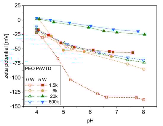 The effect of precursor Mw and plasma power during deposition in the pH range from 4 to 8 is shown in Figure 3. Generally, almost all the samples showed negative zeta potential values depending on the Mw and RF power applied during the preparation. This can lead to the assumption that the film surface was widely covered with ionic or charged groups [31]. The resultant plasma film structure can be more prone to water absorption, which could lead to enhanced dissociation and the development of a negative charge [32]. Higher zeta potential values (+3.4 to −25 mV) were recorded for the samples prepared from PEO of Mw 20k and 600k at 5 W. The zeta potential of the films from lower Mw, 1.5k and 6k, prepared under the same conditions were between +1.65 and −63 mV—very close to the values of the samples prepared without plasma (0 W). A relatively significant difference is visible in the sample prepared from the precursor with the lowest Mw (1500 g/mol) without plasma power, where a steep decrease of the zeta potential to almost −140 mV was recorded. In line with the XPS results, no unambiguous statement can be made about the presence of COO– groups. Thus, the result could be because this layer was mostly washed off during the measurement when comparatively high pressure was applied.