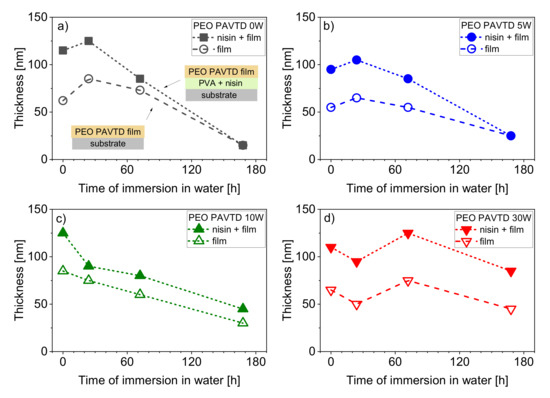 Total thickness of the PEO plasma-assisted vapor thermal deposition (PAVTD) films and of the systems of nisin-containing layer with PEO PAVTD films overcoat during immersion in water. PEO PAVTD films were prepared using precursor with Mw 1500 g/mol at (a) 0 W, (b) 5 W, (c) 10 W, and (d) 30 W.