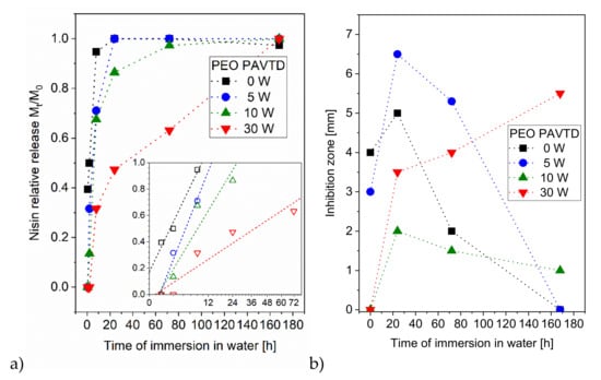 The retention of nisin bioactivity was monitored by inhibition zone tests. The samples of nisin-containing layer with PEO PAVTD film overcoat were immersed in 15 mL of demineralized water at laboratory temperature. Aliquots (1 mL) were withdrawn at defined intervals and microbiological analysis by an agar diffusion test using Staphylococcus aureus followed. One milliliter of bacterial suspension (106 to 107 cfu/mL) was transferred onto sterile Petri dishes containing a Mueller Hinton agar. An eluate (100 µL) was then inserted into the bored wells of 8 mm in diameter and incubated at 35 °C for 24 h. After the incubation period, the inhibition zone diameters around the samples were recorded. The antimicrobial susceptibility of nisin released through PEO films was compared with the antibacterial susceptibility of nisin solutions against Staphylococcus aureus where the threshold concentration of nisin to induce visible inhibition zone was 2 ug/ml.