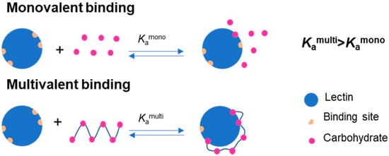 Schematic representation of the binding between lectins and one carbohydrate (monovalent binding) or two or more carbohydrates (multivalent binding).