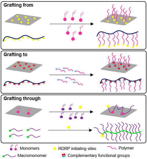 Polymer brushes are densely grafted polymers that can be found attached to several solid surfaces [19] or in their free form, also known as bottlebrushes [20,21]. These polymers can be prepared using RDRP methods mainly by three strategies, “grafting to”, “grafting from”, and “grafting through”, (Figure 3) with extreme precision over molecular weight, grafting density, and grafting thickness [16,22]. In the “grafting to” approach, the polymeric side chains are synthesized separately by appropriate RDRP techniques, with functional chain-end groups complementary to the ones present on the polymer backbone or surface. In a second step, both functional polymeric side chains and backbone or surface will be covalently linked (e.g., using “click” chemistry methods), to form the polymer brush [16,22]. With “grafting to”, it is possible to characterize individually the backbone and side chains, but steric hindrance problems and slow diffusion of these chains associated with this strategy could lead to low grafting density, thus requiring additional purification steps to remove unreacted side chains. In the “grafting from” method, a monomer is polymerized directly from a surface or a polymer backbone with predefined initiation sites, from which the polymeric side chains will grow [16]. Usually, polymerizations are conducted under diluted conditions to ensure a low concentration of radicals, as well as small polymerization rate, in order to minimize possible termination reactions, which would lead to significant structural defects considering the large size of polymer brushes. Within the three approaches, the “grafting-from” is the preferred one for the synthesis of brushes with high grafting density. Finally, the “grafting through” consists on the polymerization of macromonomers to obtain bottlebrushes or the use of surfaces containing immobilized monomers for the incorporation of a growing polymer chain in solution, which can be linked to the surface through one or more points, depending on the degree of surface functionalization. While this could be a good strategy to modify some surfaces (e.g., glass), the “grafting through” seems to be less suitable when using, for instances, a dispersion of nanoparticles (NPs) immobilized with monomers, as the growing polymer can easily incorporate monomers from different NPs, thus affecting the homogeneity of the final brush. Interesting, there is also one work proposing a new “grafting through” method for the synthesis of polymers brushes based on monomer supply through porous surfaces [23]. There are few reports of the synthesis of glycopolymer brushes by grafting through, specially by RDRP methods. Detailed information on the preparation of polymer brushes immobilized in surfaces can be found in a review article [22].