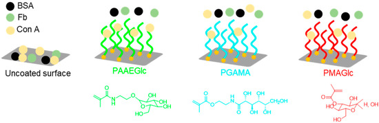 Specific protein interaction of BSA, Fb, and Con A with different glucose-based brushes.