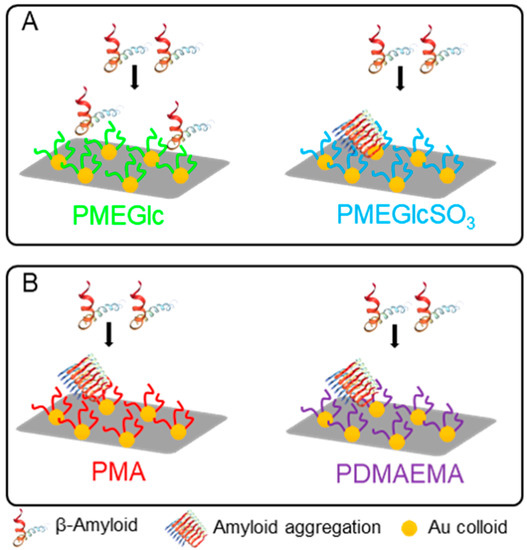 - Kitano, H.; Saito, D.; Kamada, T.; Gemmei-Ide, M. Binding of β-Amyloid to Sulfated Sugar Residues in a Polymer Brush. Colloids Surf. B Biointerfaces 2012, 93, 219–225. [Google Scholar] [CrossRef]